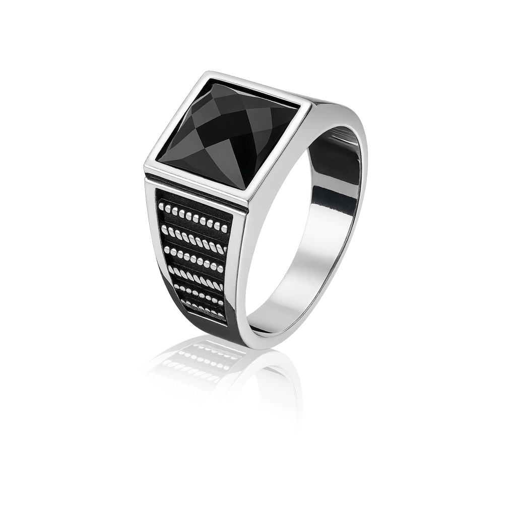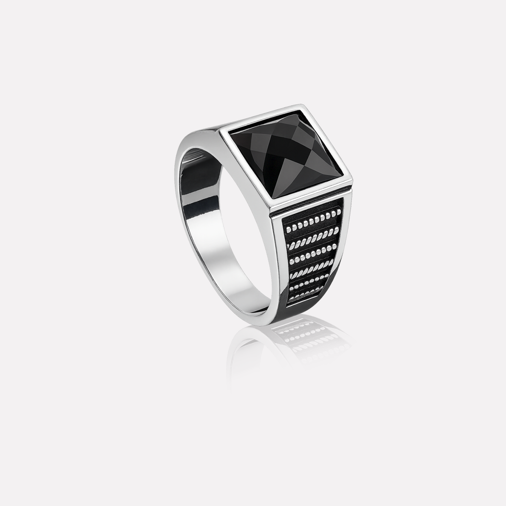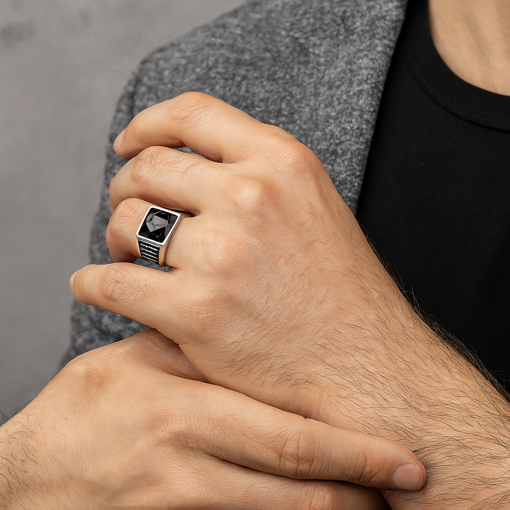 Make a bold impression with this 92.5 sterling silver men’s ring, featuring a striking faceted black onyx gemstone in a sleek square setting. The polished silver band is accented with intricate detailing, adding depth and modern masculinity to the design. Known as a stone of strength and protection, black onyx enhances confidence and resilience, making this ring not just a fashion accessory but also a symbol of power. Perfect for both everyday wear and special occasions, this piece reflects timeless elegance with a contemporary edge