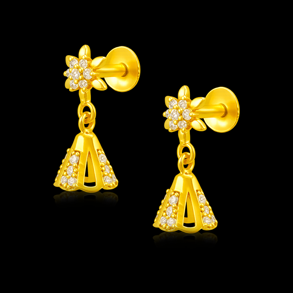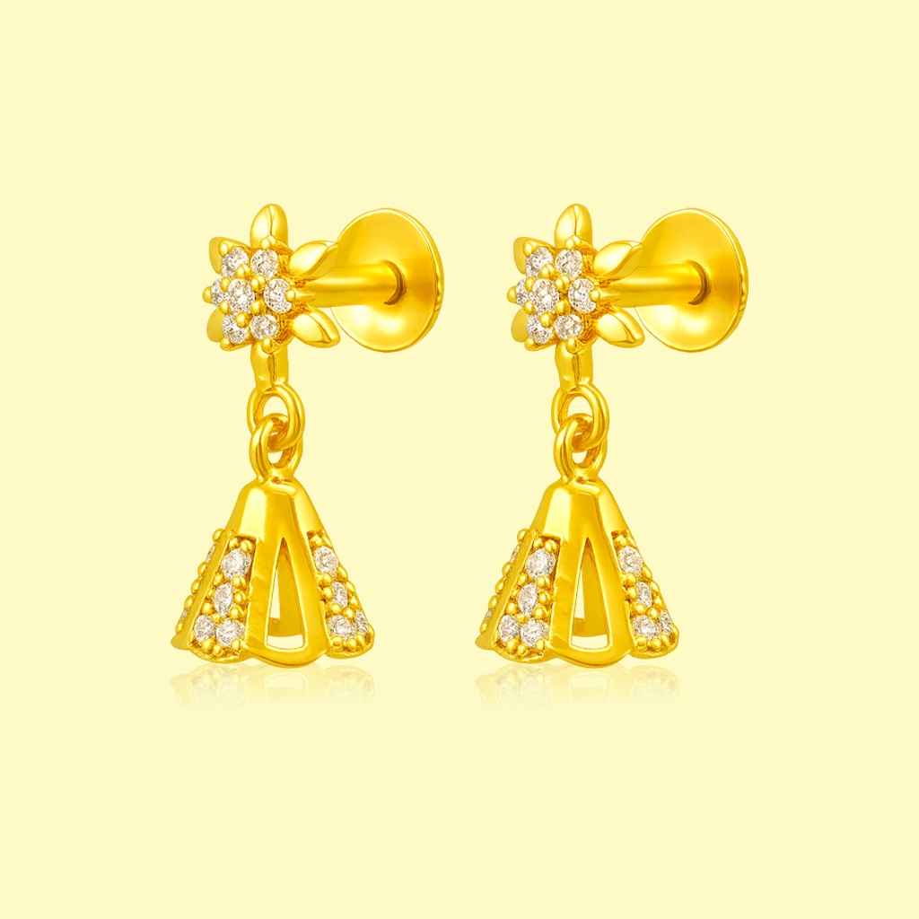 Bring a touch of sparkle to your festive style with these 92.5 sterling silver earrings plated in radiant gold. The design features a dazzling floral stud encrusted with CZ stones, gracefully suspending a cone-shaped jhumka with stone-studded detailing on each side. Lightweight yet elegant, these earrings are the perfect pick for weddings, parties, and traditional occasions, offering a modern twist to the timeless jhumka style.