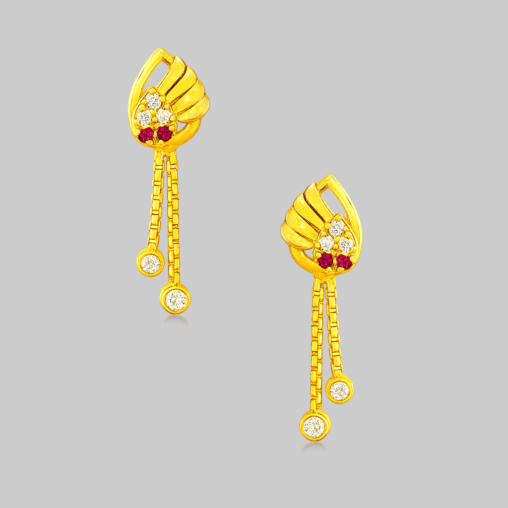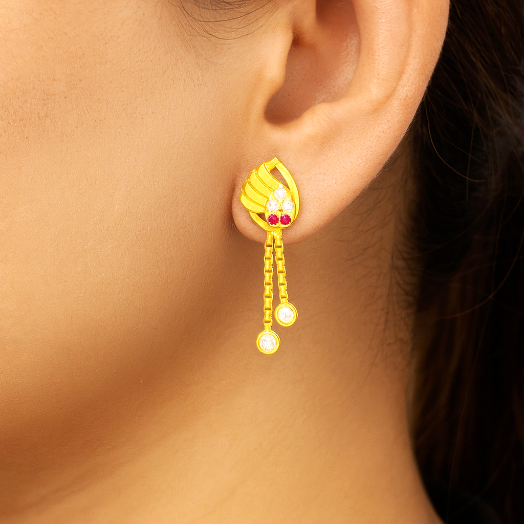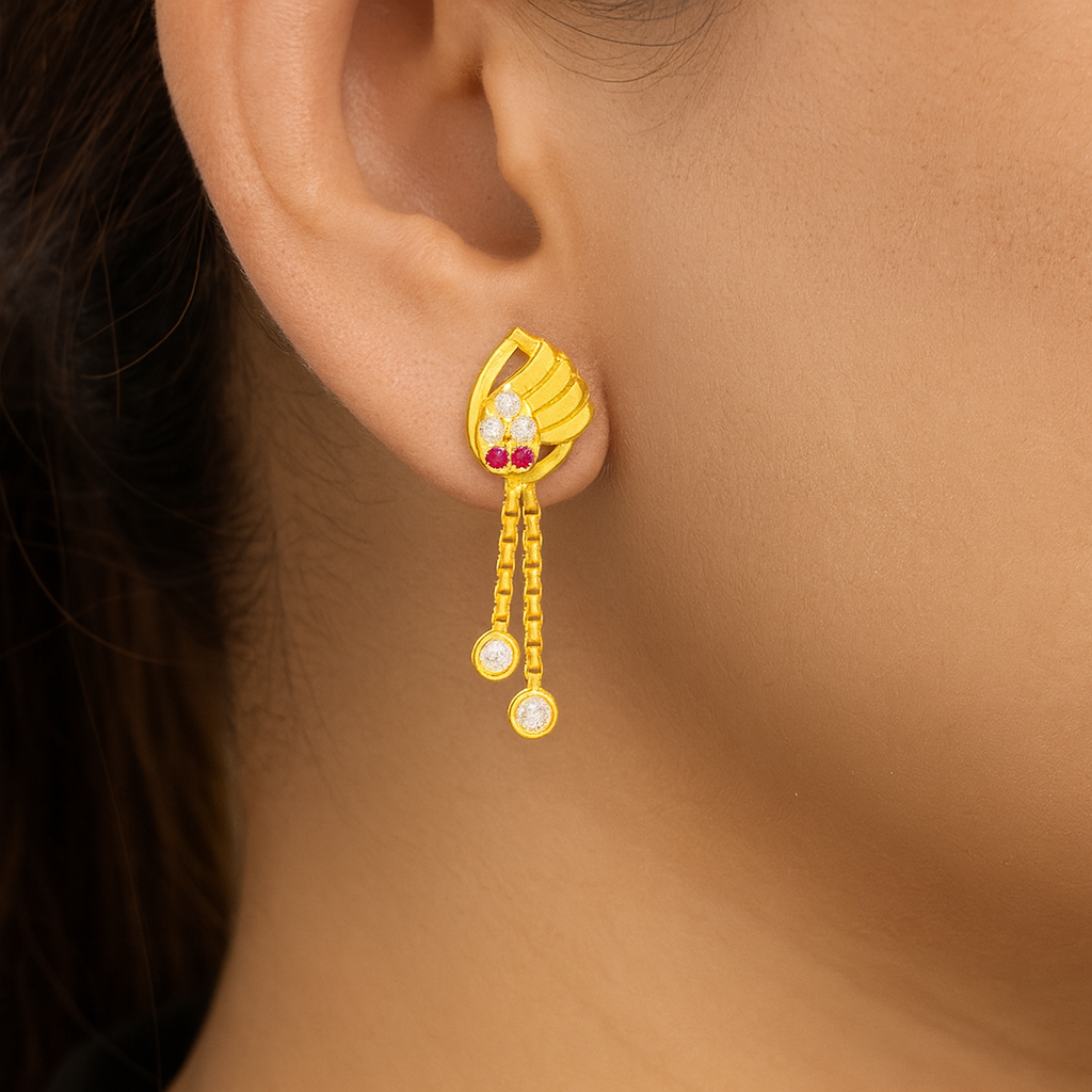 Bring elegance to every occasion with these 92.5 sterling silver gold-plated dangler earrings, designed in a graceful floral-inspired motif. Adorned with sparkling white CZ stones and vibrant ruby-red accents, the dual-chain dangler adds a modern touch to traditional charm. Perfect for festive wear, weddings, and parties, these earrings are a blend of beauty, craftsmanship, and sophistication.