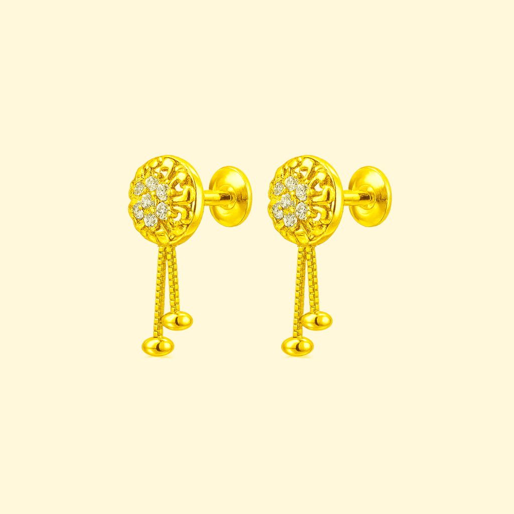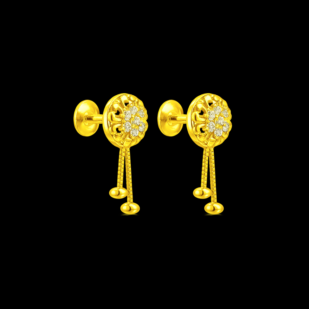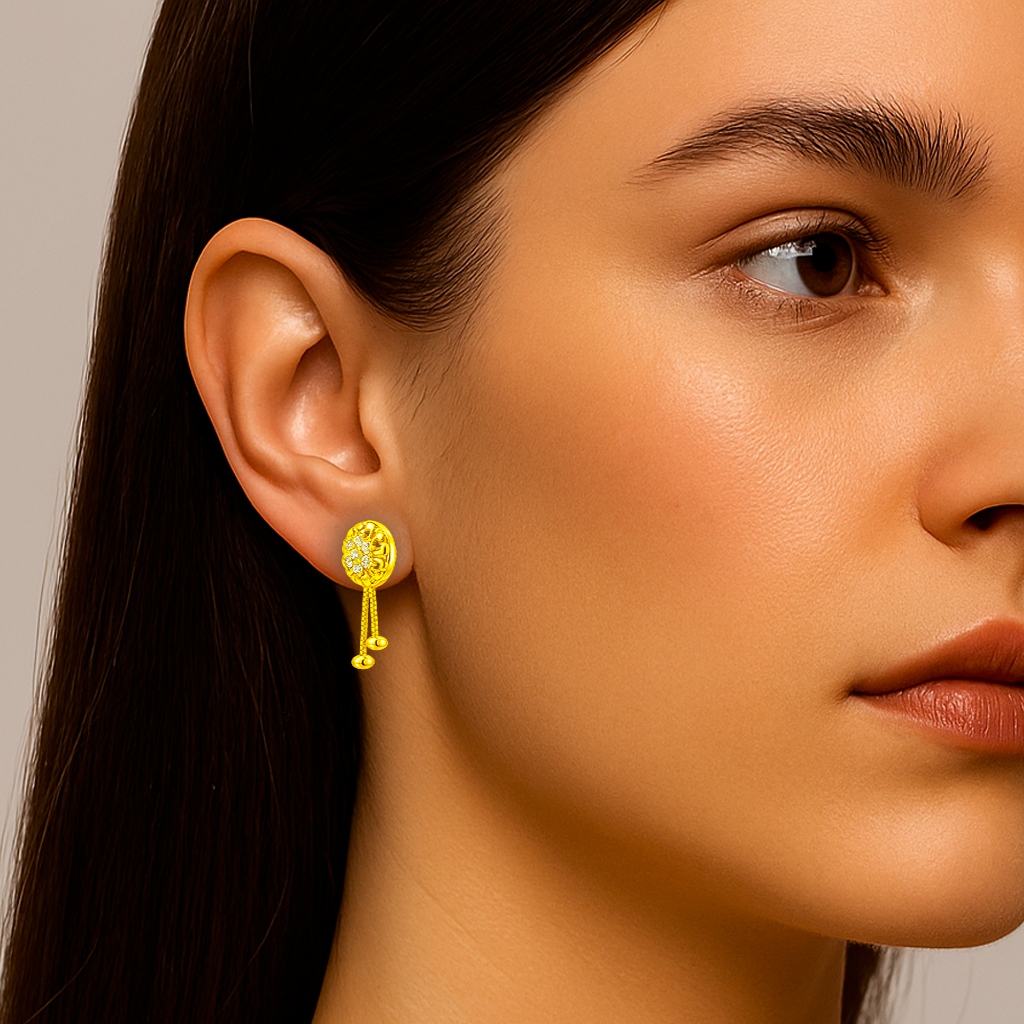 Add a touch of elegance with these 92.5 sterling silver gold-plated stud earrings for women, featuring a round floral motif embellished with sparkling CZ stones. The dual-chain danglers with bead drops enhance their charm, making them perfect for festive wear, weddings, and special occasions. Lightweight and stylish, they combine traditional beauty with modern appeal.