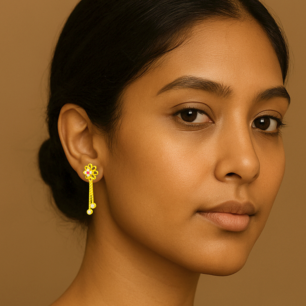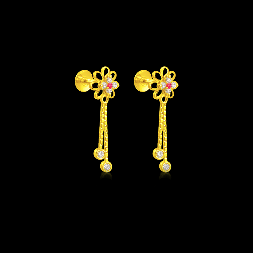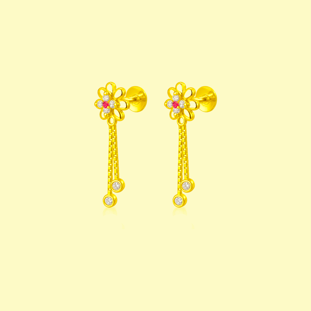 Enhance your traditional look with these 92.5 sterling silver gold-plated earrings for women, designed with a delicate floral motif adorned with sparkling CZ stones and a hint of red accent at the center. The dual-chain danglers with shimmering drops add graceful movement, making them perfect for festive occasions, weddings, or everyday elegance.