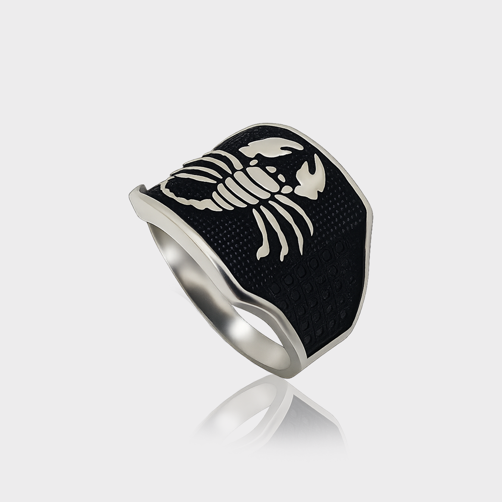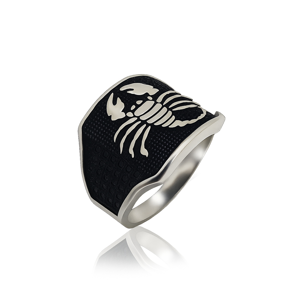 This bold 92.5 sterling silver men’s ring features a striking scorpion design engraved on a textured black oxidized background. The powerful scorpion symbolizes strength, protection, and determination, making this ring an ideal accessory for men with fearless personalities. Crafted with precision, the polished silver contrasts beautifully with the dark detailing, giving it a rugged yet sophisticated look. Perfect for daily wear or as a zodiac-inspired statement piece, this ring reflects confidence and individuality.