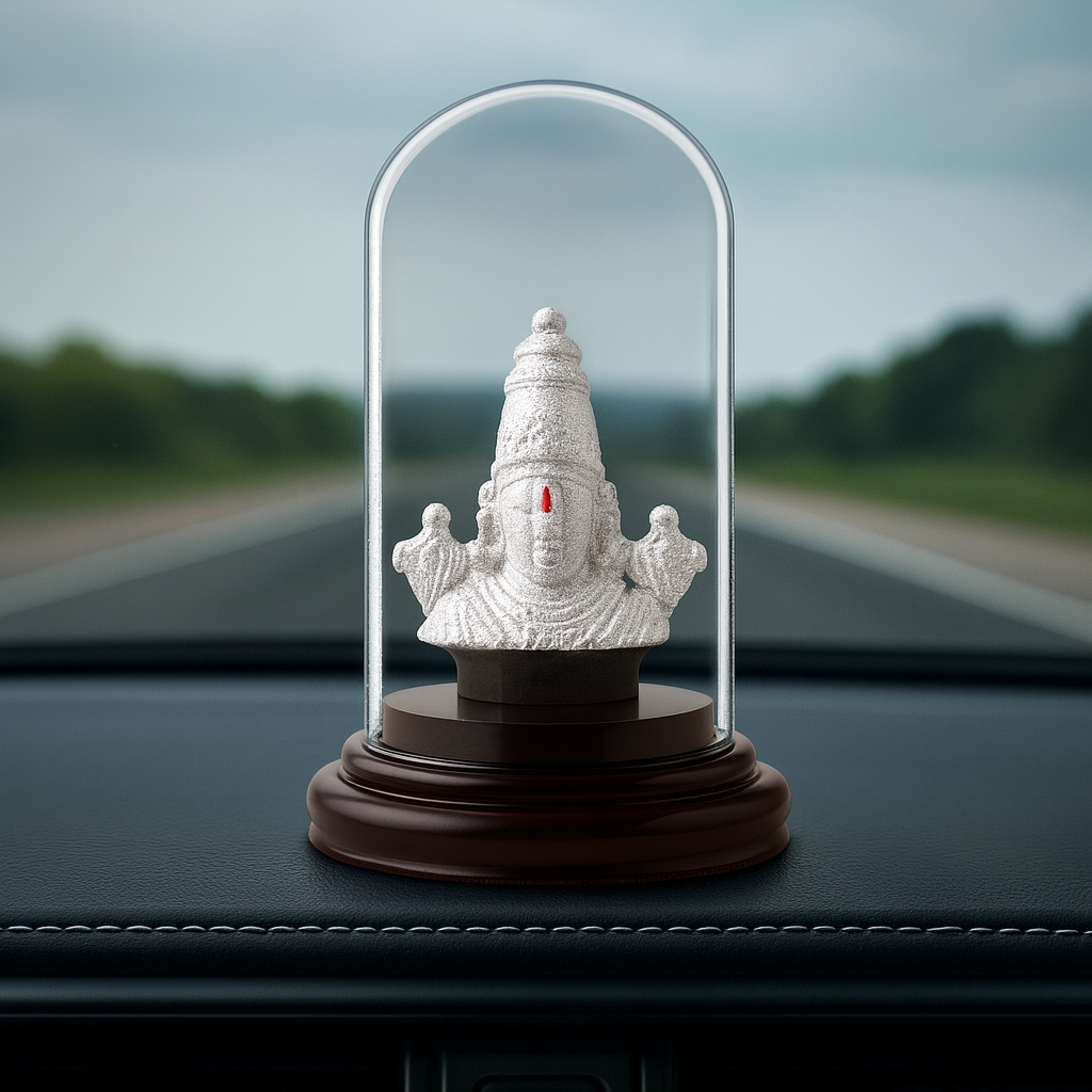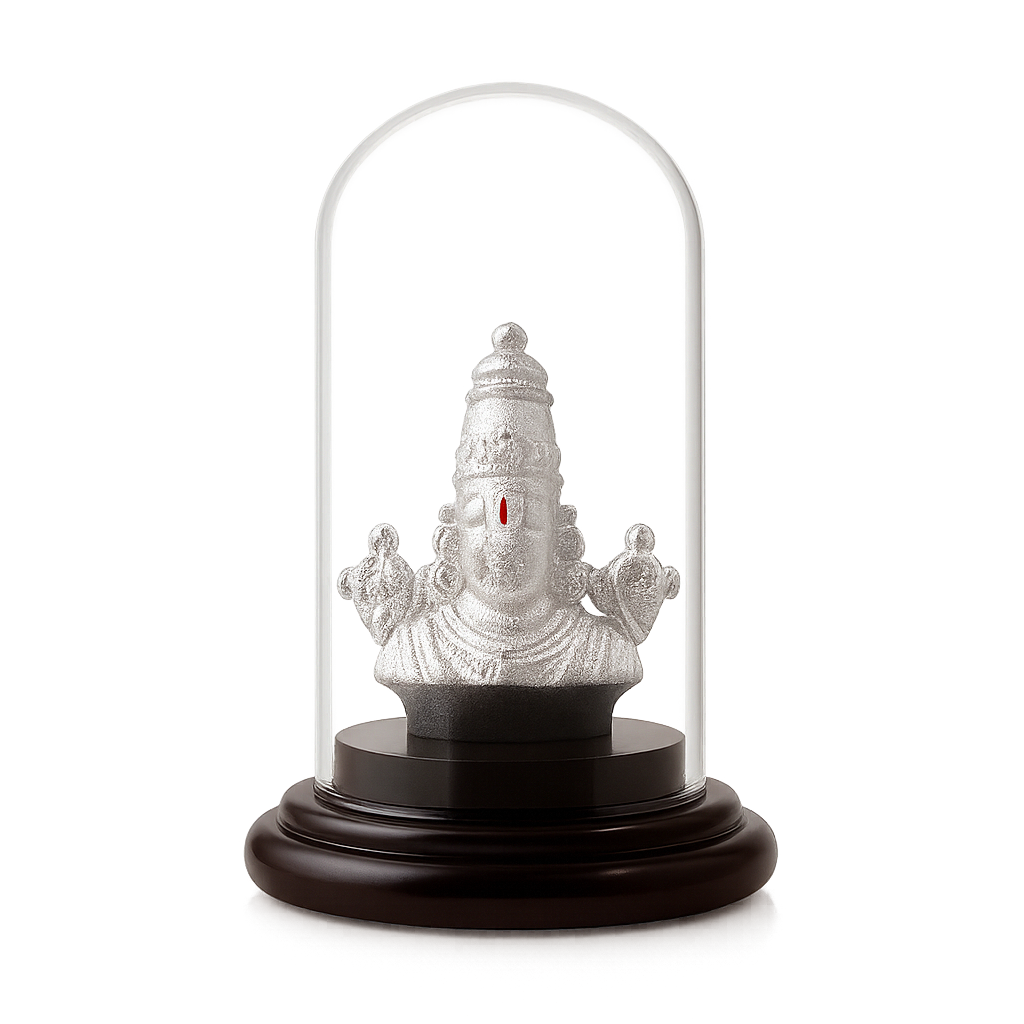 Experience divine grace with this intricately designed 99.9% pure silver Balaji idol, beautifully encased in a protective glass dome with an elegant wooden base. Crafted with precision, the idol radiates purity and spiritual energy, making it a symbol of devotion and prosperity. Compact in size, it is perfect for pooja rooms, workspaces, car dashboards, or as a thoughtful gift for auspicious occasions like weddings, housewarmings, and festivals.