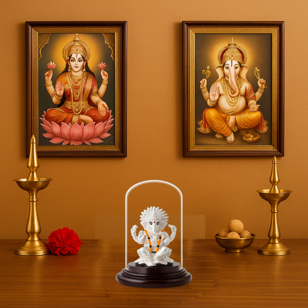 Bring home the blessings of Lord Ganesha with this beautifully handcrafted 99.9% pure silver idol, encased in a protective glass dome with an elegant wooden base. Designed with intricate detailing, the idol radiates divine energy and positivity. Lord Ganesh, known as the remover of obstacles and harbinger of success, makes this idol perfect for pooja rooms, offices, car dashboards, or as a sacred gift for auspicious occasions like Ganesh Chaturthi, weddings, and housewarmings.