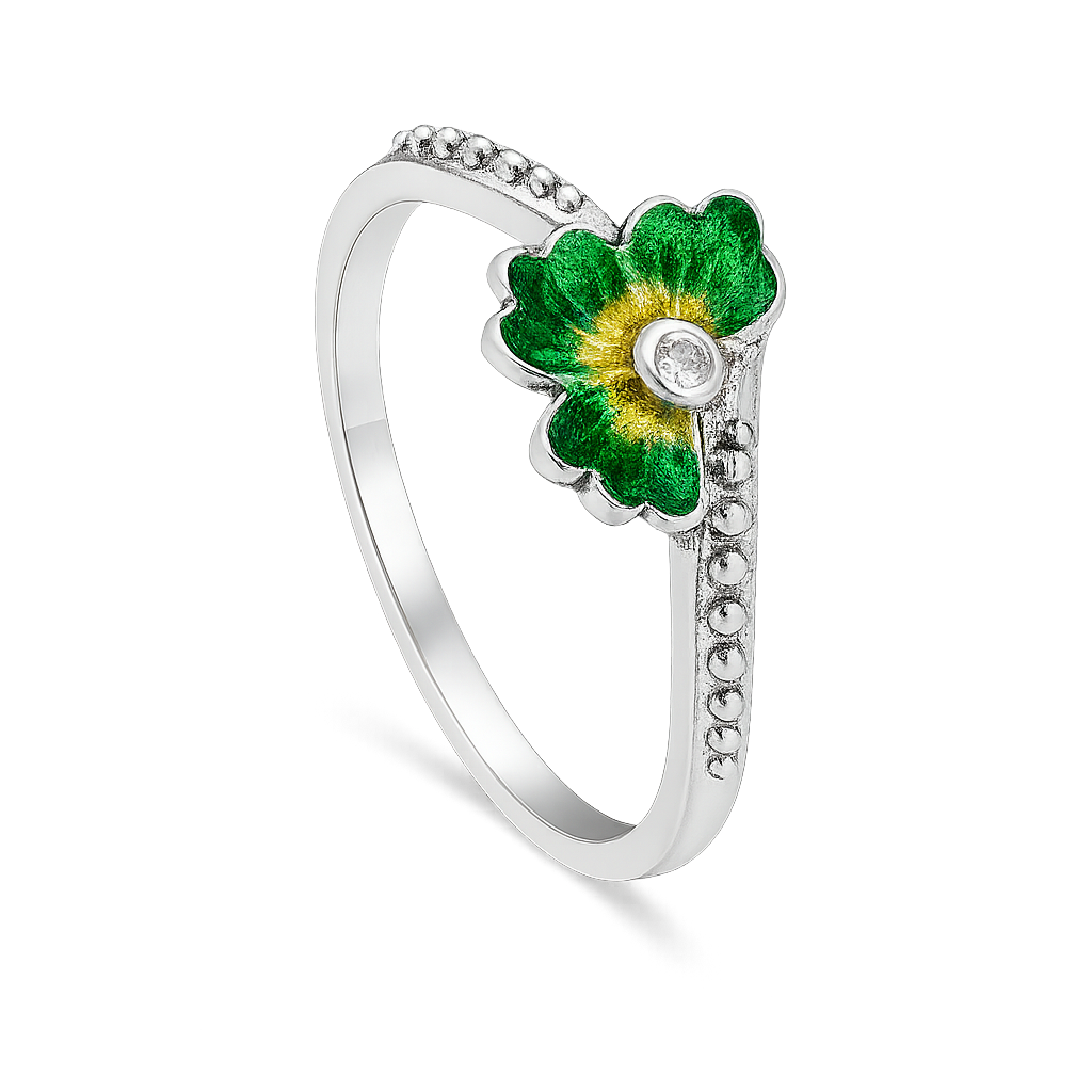 Delicately designed to blend nature’s charm with timeless elegance, this 92.5 sterling silver fancy ring features a three-leaf flower motif adorned with vibrant green enamel paint and a sparkling centerpiece. The fine detailing on the band, paired with the glossy floral design, adds a graceful and feminine touch. Crafted in genuine 92.5 silver, this ring is both durable and skin-friendly, perfect for daily wear or special occasions. A beautiful choice for women who appreciate floral elegance and artisanal silver jewellery.