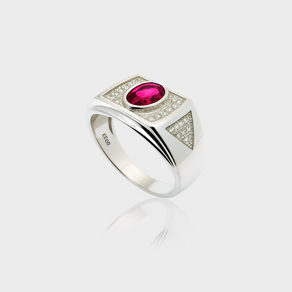 Elevate your style with this premium 92.5 sterling silver men’s ring, featuring a striking oval-cut ruby-red stone set in a bold rectangular frame. The rich centerpiece is surrounded by shimmering cubic zirconia stones, adding a luxurious sparkle that complements its masculine design. Crafted with precision and polished to perfection, this ring is both durable and timeless.