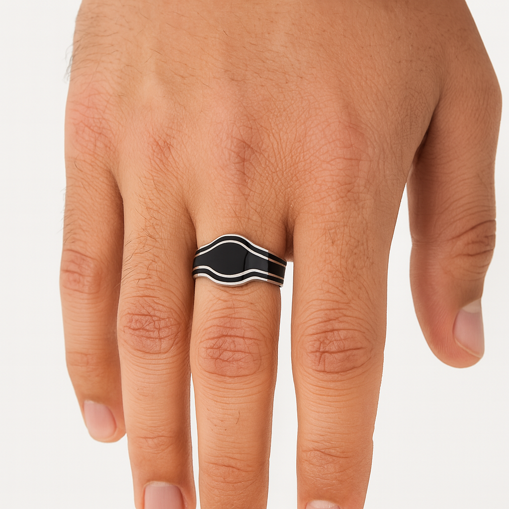 This refined 92.5 sterling silver men’s ring showcases a sleek curved black onyx inlay, designed with a smooth, modern finish. Inspired by Turkish jewelry artistry, the minimalist style balances elegance and masculinity, making it perfect for everyday wear. Black onyx, known for its grounding and protective properties, adds strength and meaning to this timeless accessory. A versatile piece for men who value sophistication, heritage, and simplicity